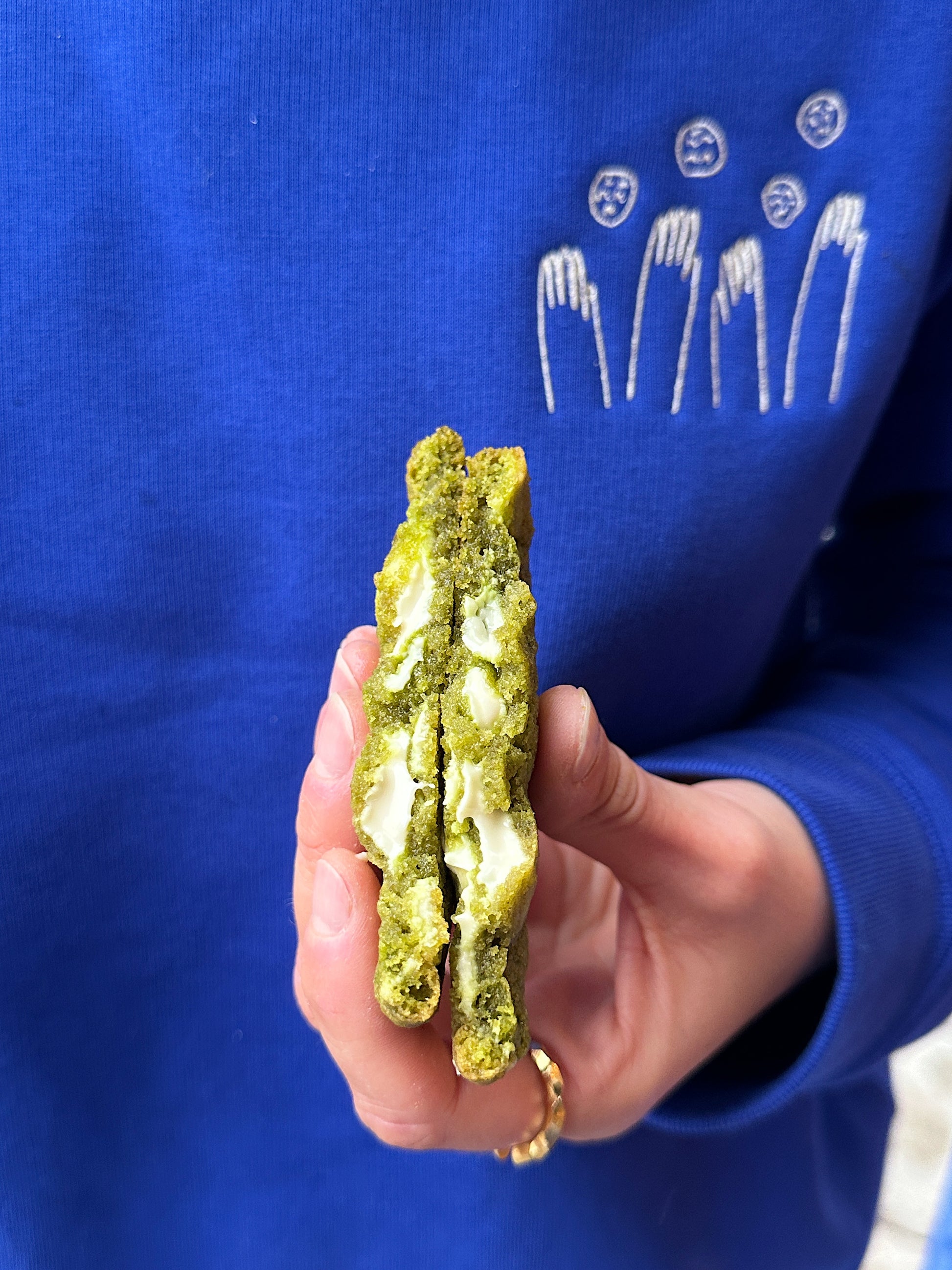 Ingredients: butter, brown sugar, white sugar, wheat flour, rye flour, baking powder, baking soda, matcha powder, salt, white chocolate