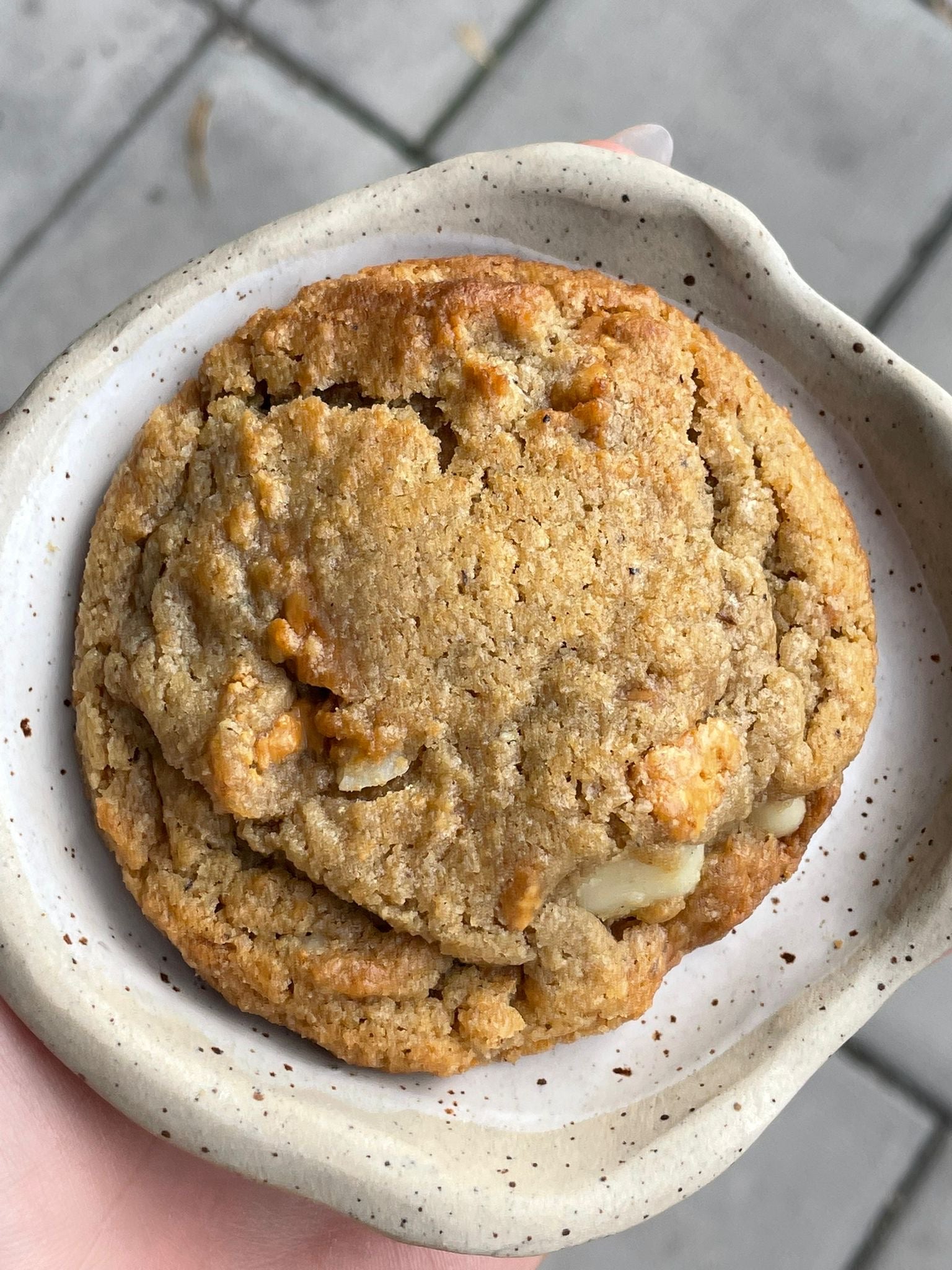 Our current Cookie made from gluten free ingredients is a gooey buckwheat cookie dough, filled with homemade caramelised white chocolate pieces and macadamia nuts.